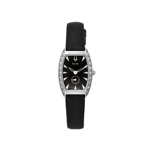 This classic Swiss-made timepiece by Bulova for ladies offers a stainless steel case and black leather strap. The black dial includes a second-counting subdial and is complemented by a diamond-accented bezel. The Swiss quartz movement, scratch-resistant sapphire crystal, and water-resistance of up to 30 meters ensure lasting quality.