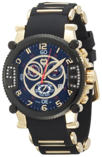 This stainless steel timepiece has yellow gold electroplating on the case and black IP plating on the bezel. The combination of white diamonds on the black IP bezel and yellow-gold electroplating on the case is striking. The smooth black silicone rubber strap includes yellow-gold plated links. The chronograph function gives a sporty look and increased functionality.