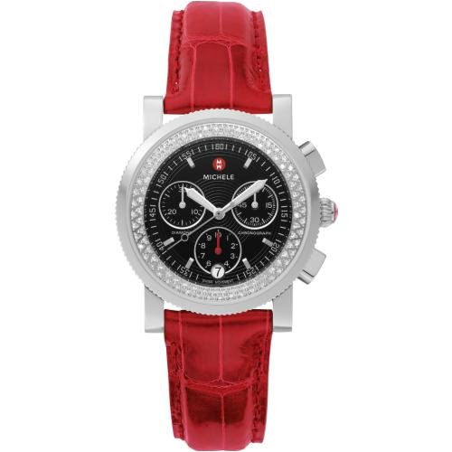 Ninety six glittering diamonds circle the black enamel dial of our Sport Sail timepiece. A three-eye chronograph and date window make this timepiece a sporty addition to any wardrobe. The garnet alligator strap is interchangeable with any 20mm Michele strap. null